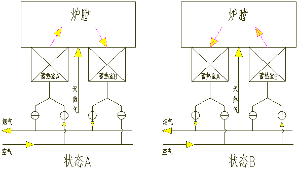 狀態(tài)B,空氣經(jīng)蓄熱室B預(yù)熱后與燃料共同進(jìn)入燃燒室,燃燒產(chǎn)生的煙氣在蓄熱室A中發(fā)生熱交換后排出。